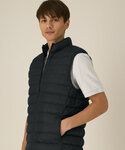 100% Recycled nylon. Men’s bodywarmer. Medium fit. Sleeveless. High collar. Reverse nylon zip at centre front. Zipped welt pockets with extra grosgrain puller. Elastic tape binding at the armhole. Fully quilted. Side panels for a better shape. Inside seams with binding finish. Bottom hem has an adjustable plastic stopper and elastic cord.